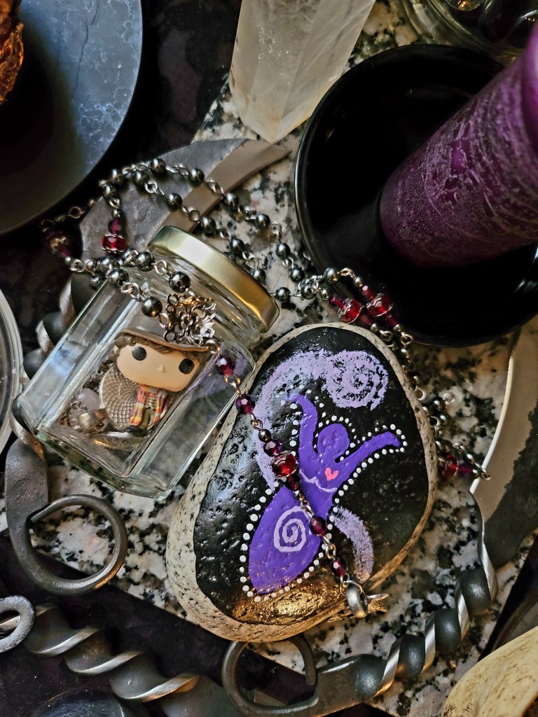 You can arrange everything and then seal the jar, or change out the items to reflect the seasons, or different aspects of the person’s life. This would be a good project for kids and individuals that may be having a problem finding a way to honor a recently passed relative or pet, or as a way to come together as a family to honor a passed member collectively, with each person contributing something. You could even do it for a beloved departed pet. Would also provide a weatherproof option for your outside Samhain and ancestor altars.